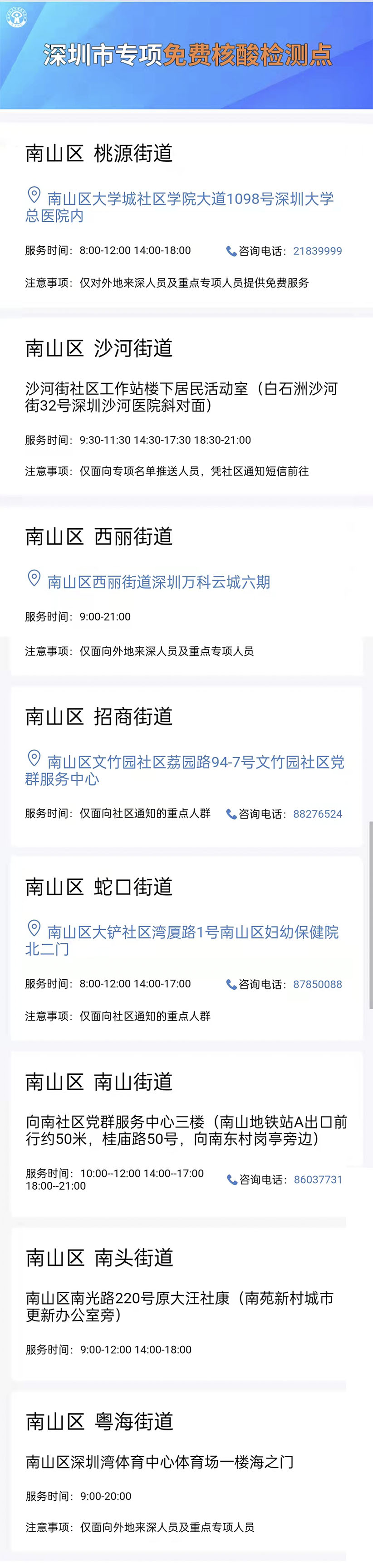深圳市卫健委免费核酸检测点查询 深圳市专项免费核酸检测点 南山区