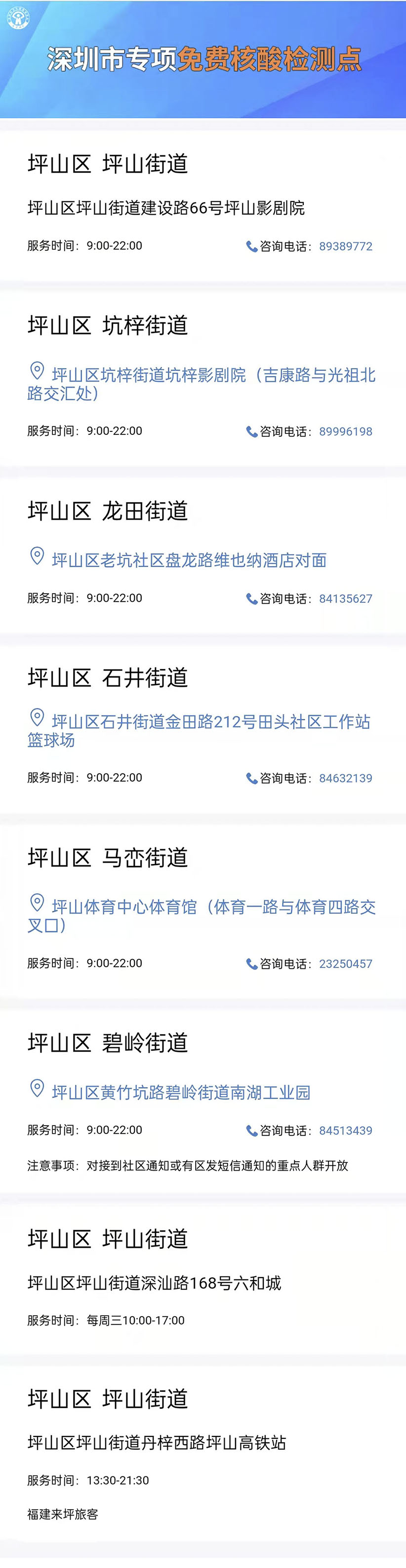 深圳市卫健委免费核酸检测点查询 深圳市专项免费核酸检测点 坪山区