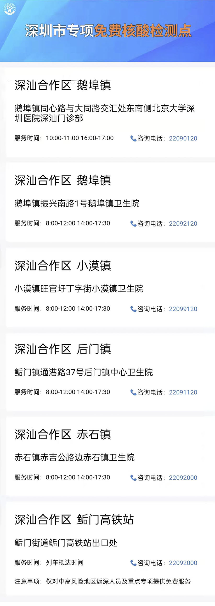 深圳市卫健委免费核酸检测点查询 深圳市专项免费核酸检测点 深汕合作区