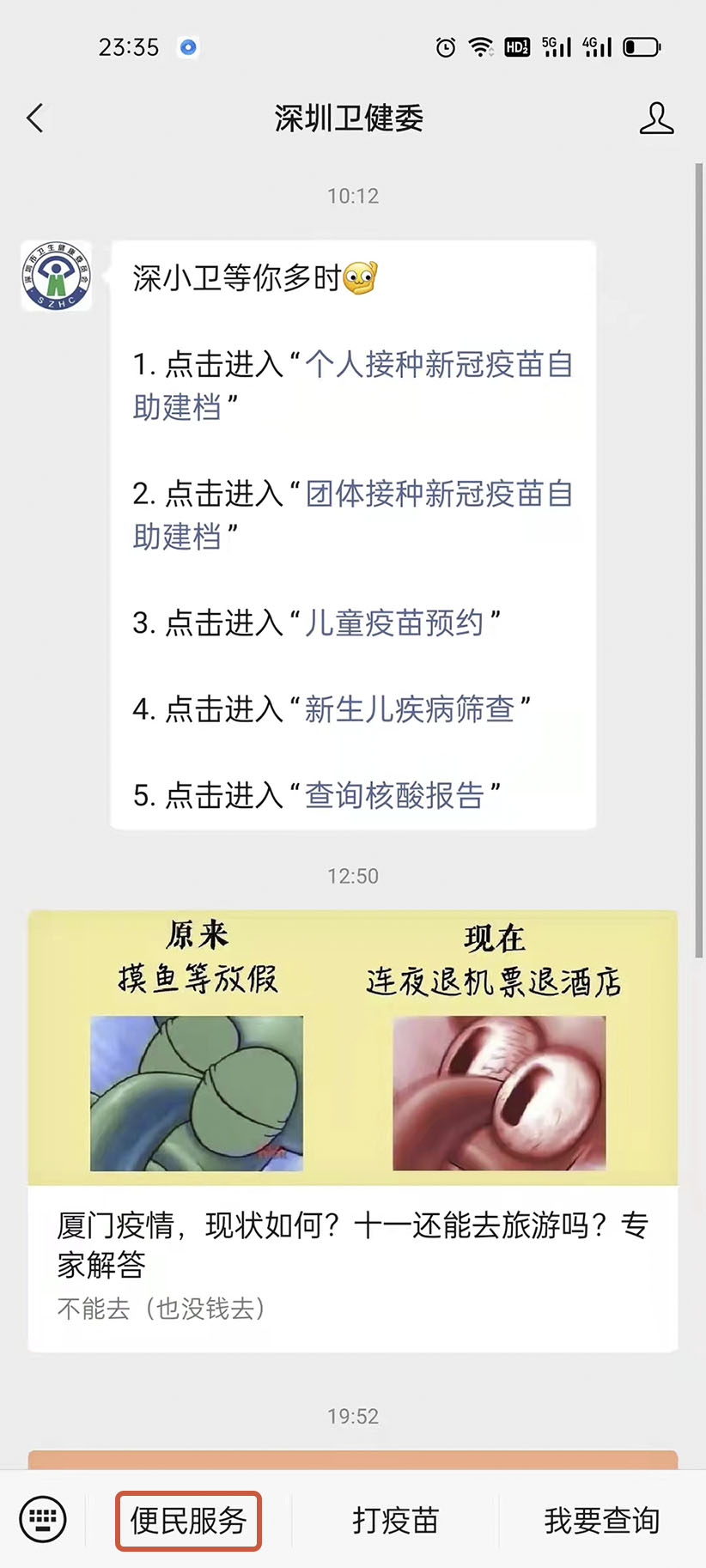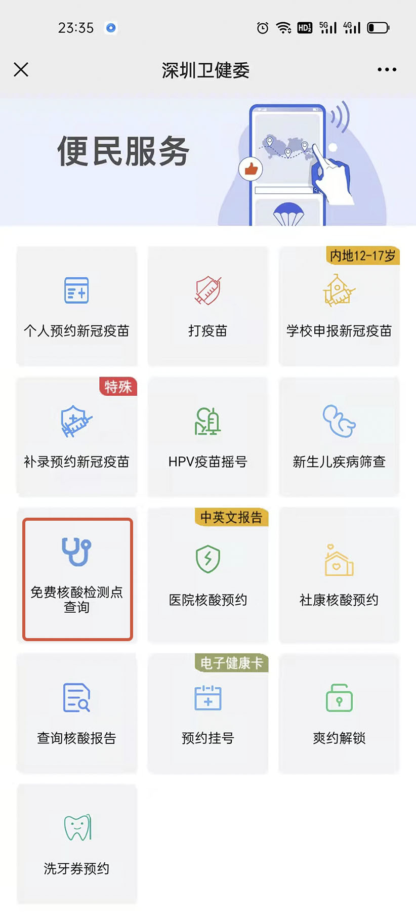 深圳市专项免费核酸检测点、进入深圳卫健公众号:点击:便民服务