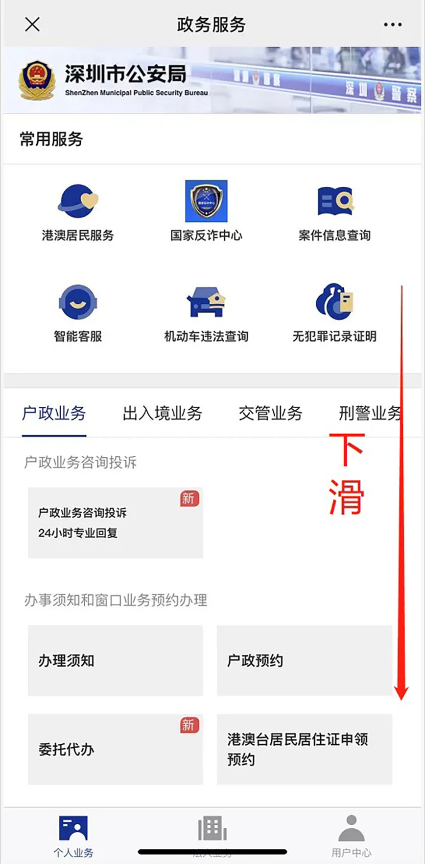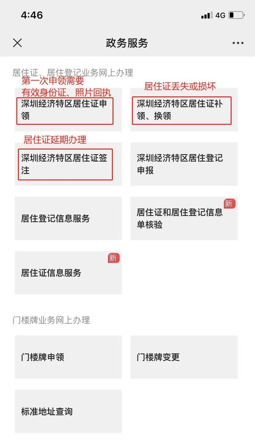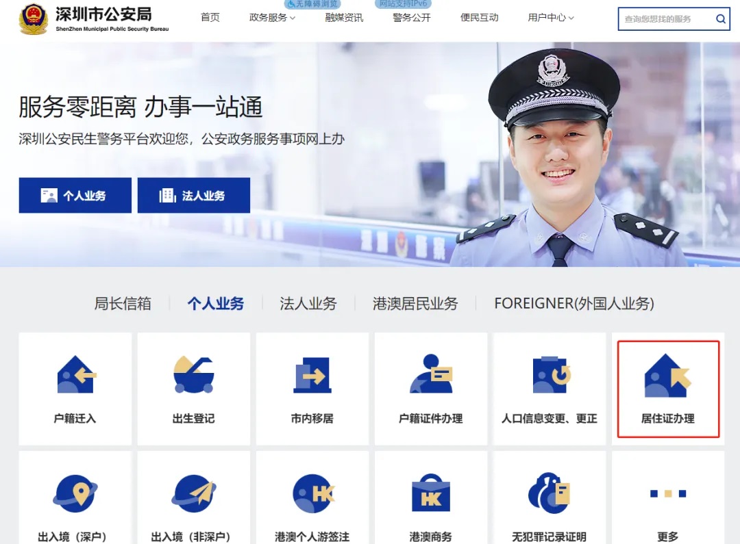 1、关注“深圳公安”服务号进入“深圳公安”政务服务页面,下滑找到【居住证、居住登记业务网上办理】板块